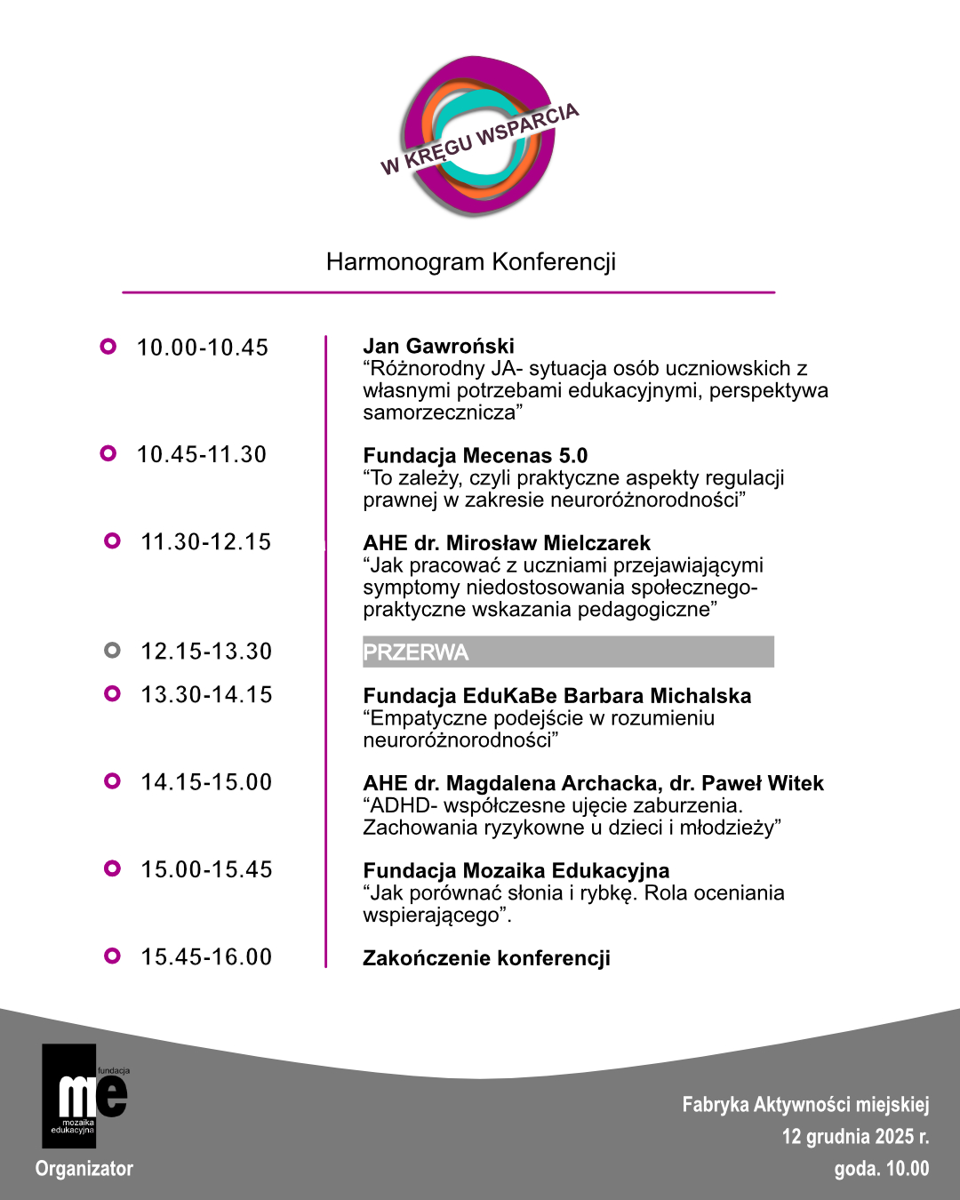 Trzecia edycja spotkań z cyklu „W kręgu wsparcia” odbędzie się jako kolejne wydarzenie poświęcone wzmacnianiu codziennej pracy nauczycieli, edukatorów oraz specjalistów pracujących z dziećmi i młodzieżą. W tej odsłonie skupimy się na neuroróżnorodności – jej znaczeniu w edukacji, sposobach budowania środowiska wspierającego różne style uczenia się oraz praktycznych strategiach pracy z uczniami o zróżnicowanych potrzebach.